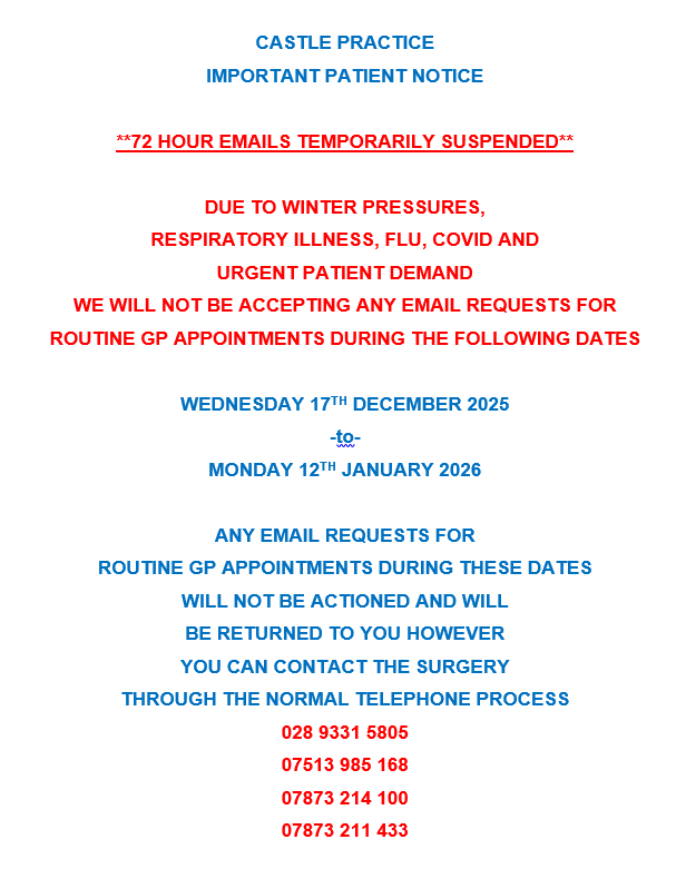 All appointments can be made by telephoning the practice on 028 9331 5805 from 8:30, the list will close once we reach capacity.